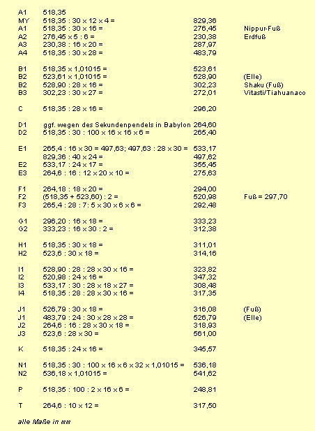 Die folgende Tabelle zeigt die mathematische Berechnung der Maßeinhaiten aus dem Bestwert der Nippur_elle resp. auseinander:
